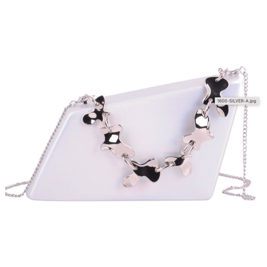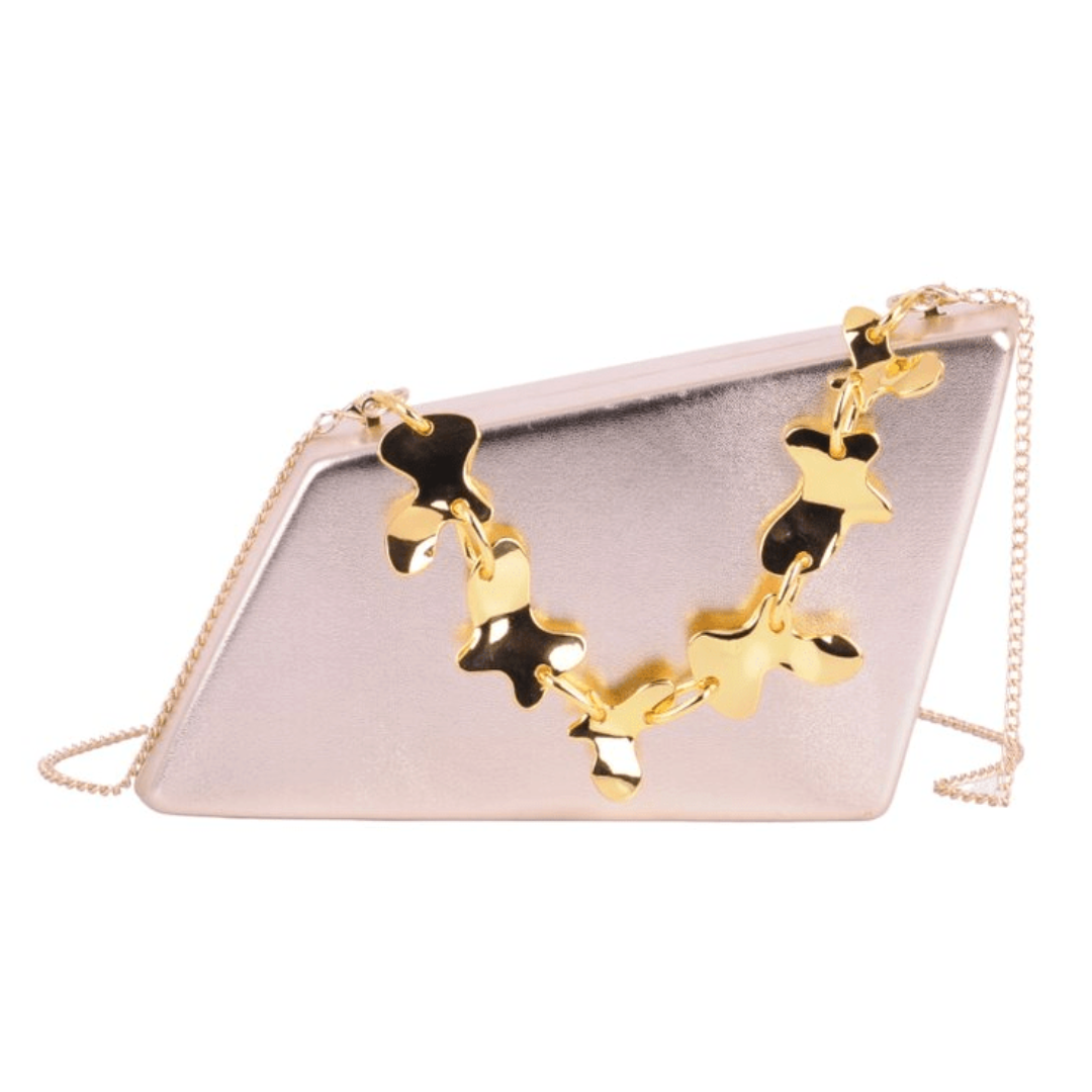 Shimmery Asymmetrical Clutch with Abstract Chain Top Handle