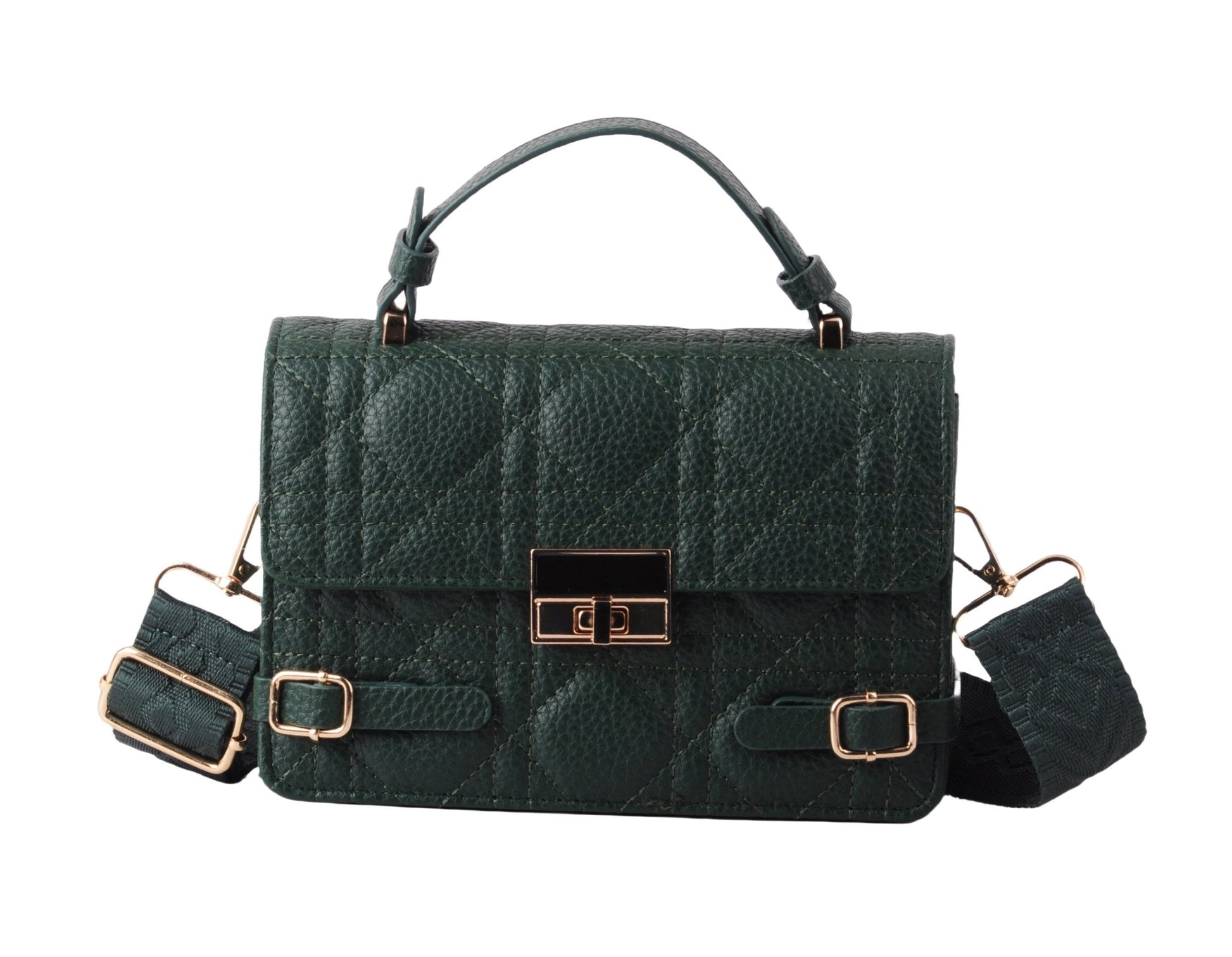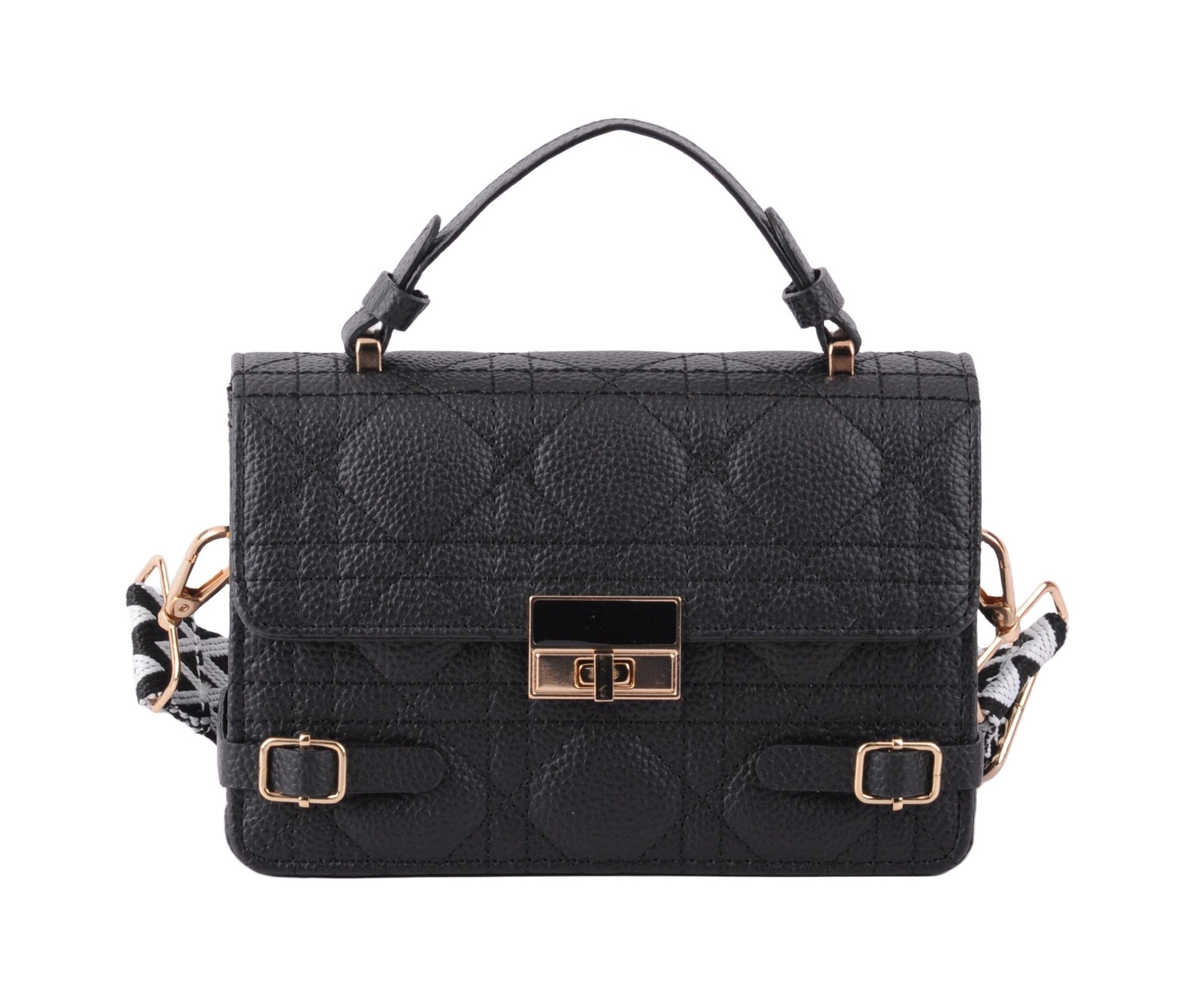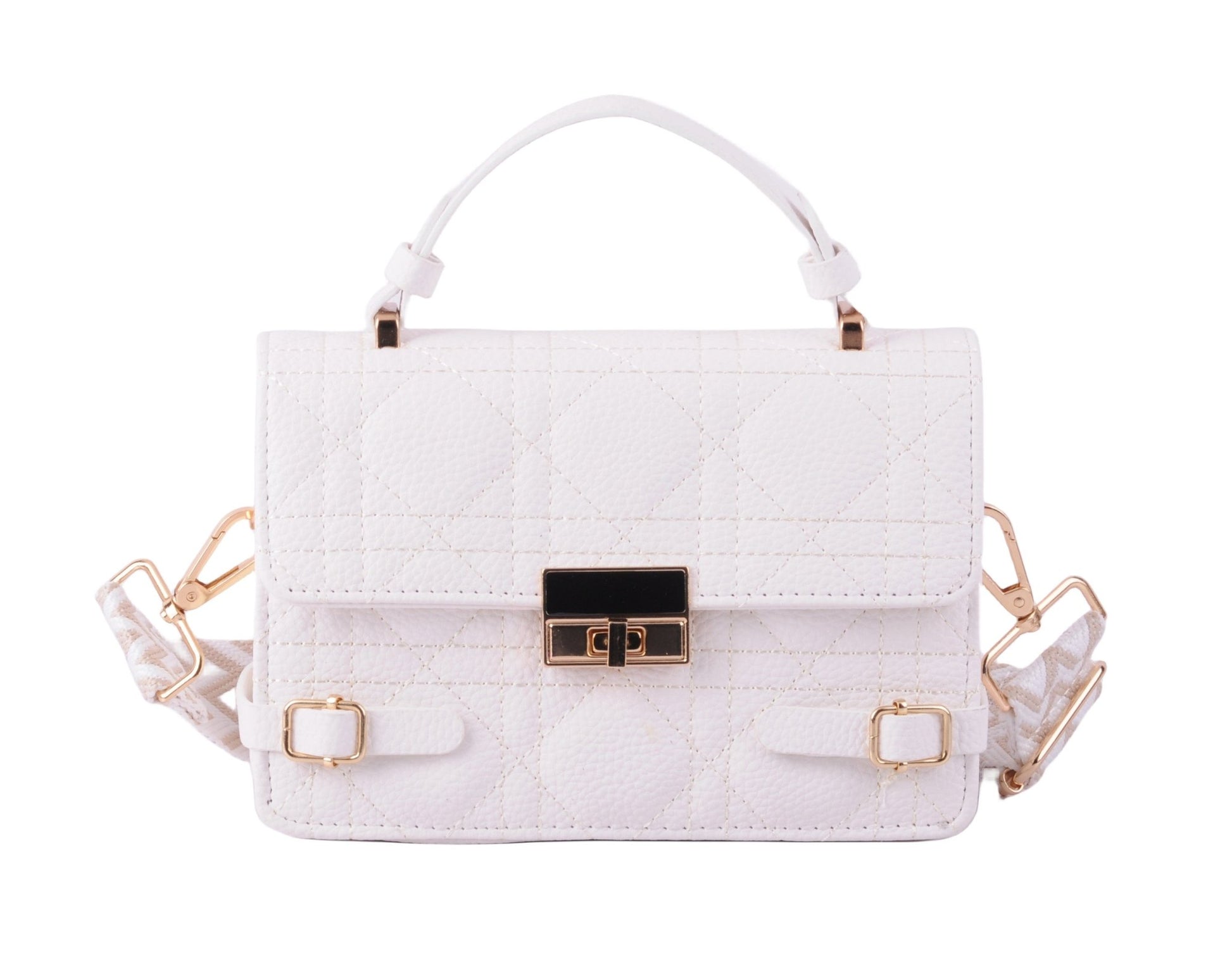 Make a statement with our Quilted Satchel featuring a metallic gold closure and luxurious vegan leather construction. This elegant accessory adds a touch of sophistication to any ensemble, making it a must-have for the fashion-forward.