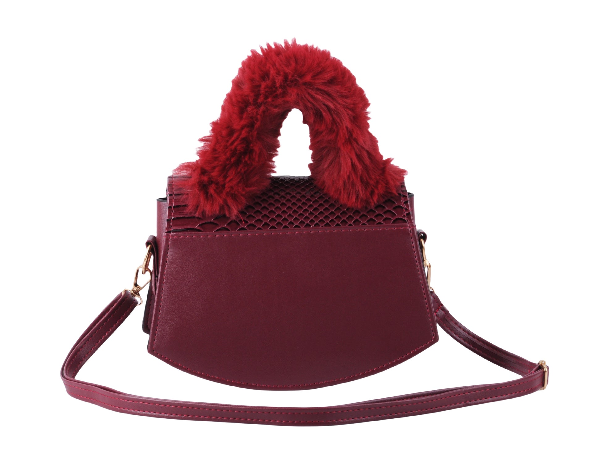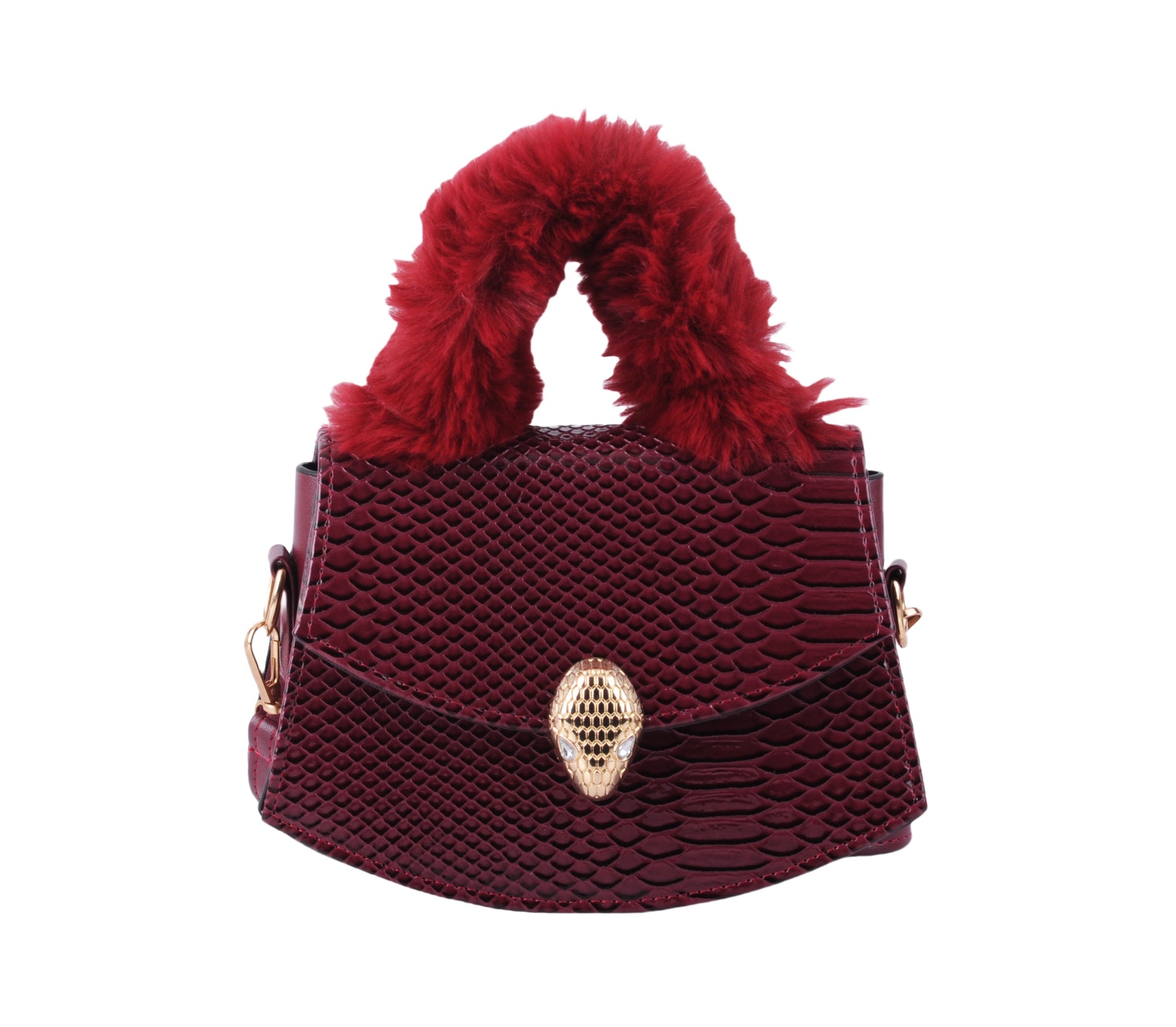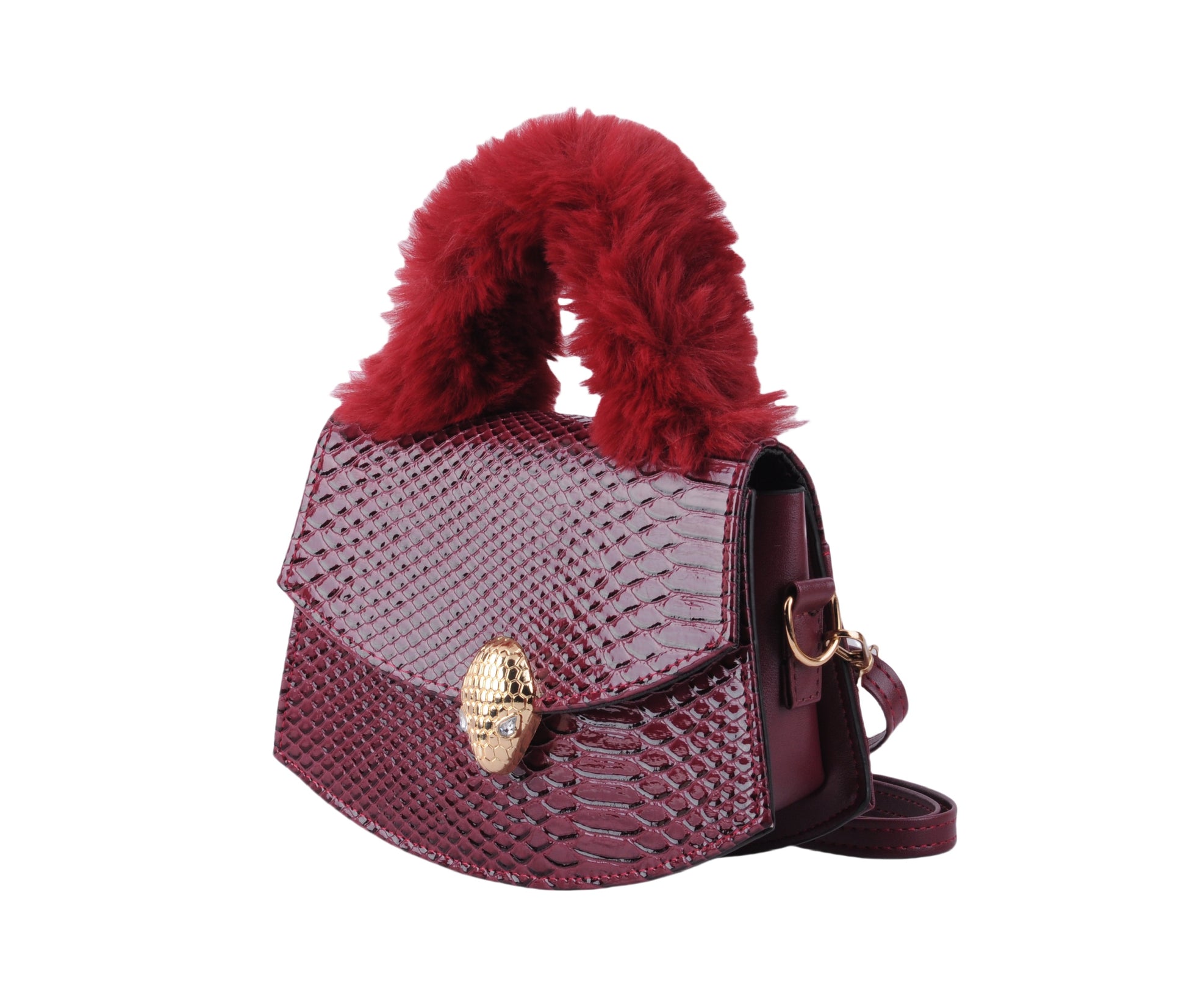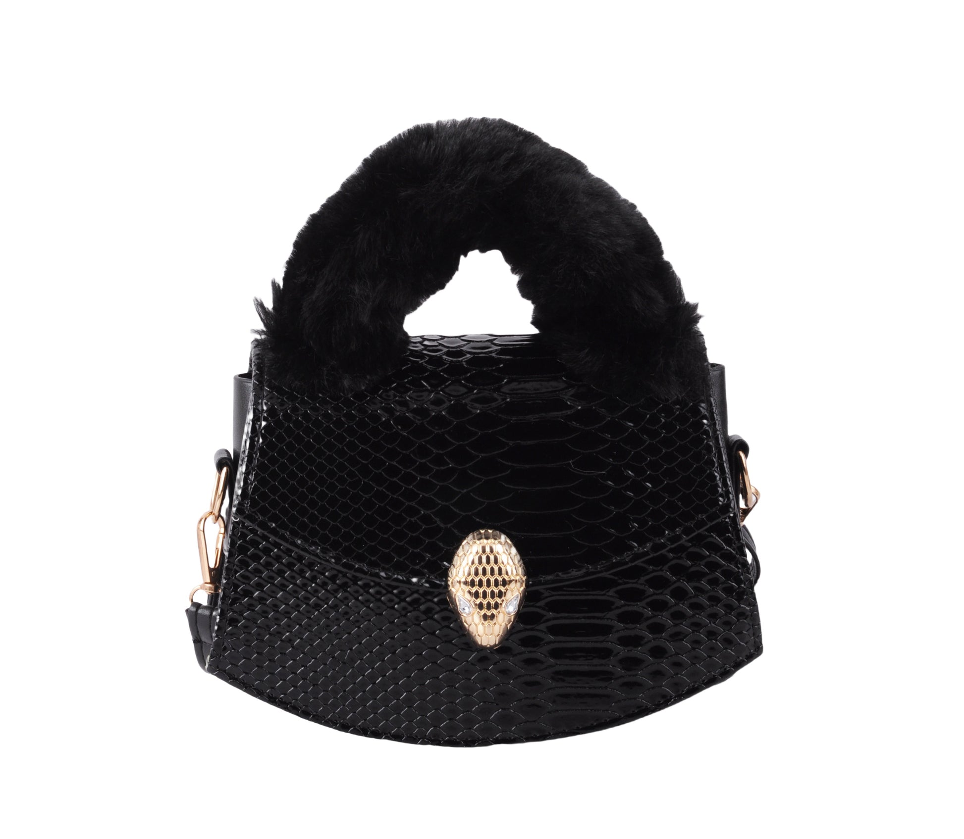 Elevate your look with this snakeskin patterned satchel, boasting a plush fur top handle for a glamorous twist. It's a striking accessory that exudes both exotic charm and luxurious appeal.