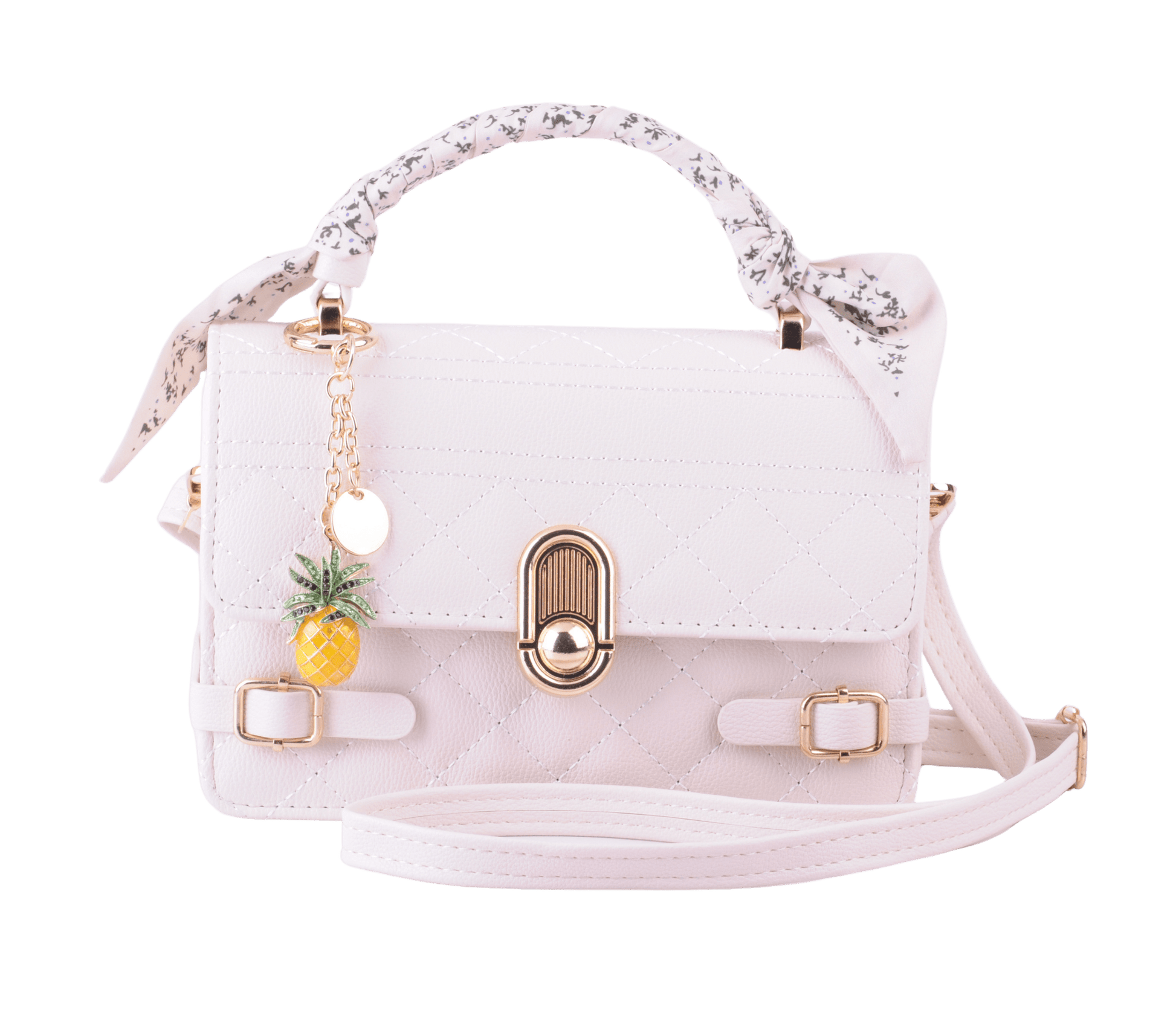 Add a tropical twist to your look with this elegant cream colored bag, featuring a playful pineapple charm and a matching scarf. The perfect blend of sophistication and fun, this stylish bag adds a personalized touch to your wardrobe, making it an ideal accessory for any occasion.