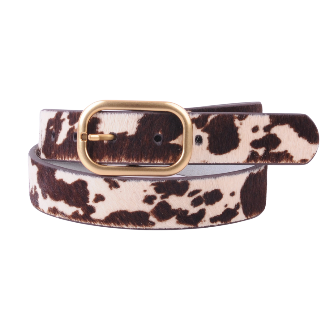 Made from genuine leather and calf hair, this belt combines texture and a bold pattern. The cow print adds a touch of ruggedness, while the rectangular buckle offers a clean, modern finish. It stands out as a statement piece, pairing well with casual or semi-casual outfits. The calf hair also gives this belt a luxurious feel!