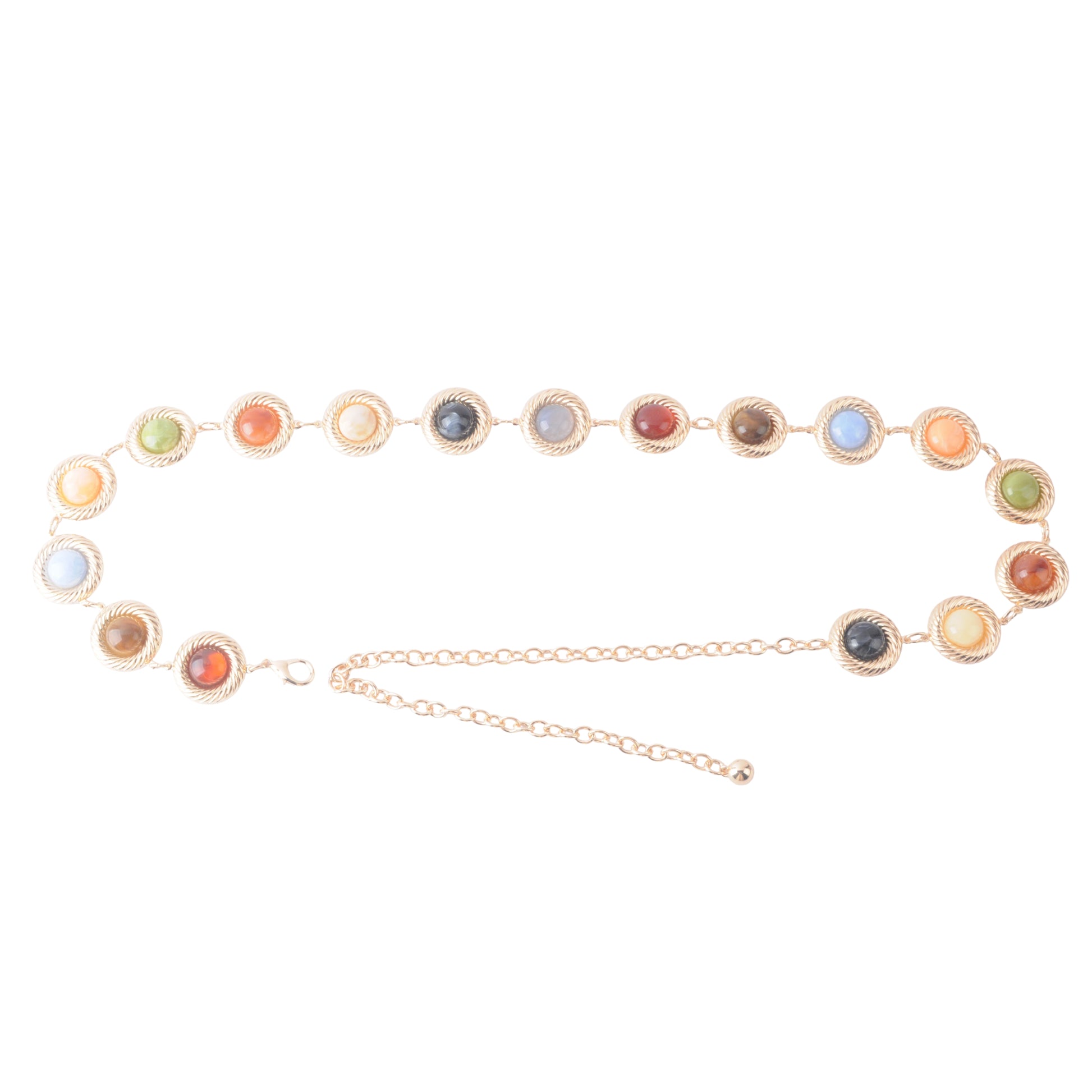 Add a pop of playful sparkle to any outfit with the Candy Crystal Multicolor Gold Chain Belt. Featuring vibrant, hard-candy-inspired stones in a rainbow of colors, this gold chain belt brings whimsical charm and effortless glamour to your waistline. Perfect for pairing with dresses, skirts, or festival outfits, it’s a fun, statement accessory that elevates any boho-chic or party-ready look. Adjustable and lightweight, it’s designed for both style and comfort.