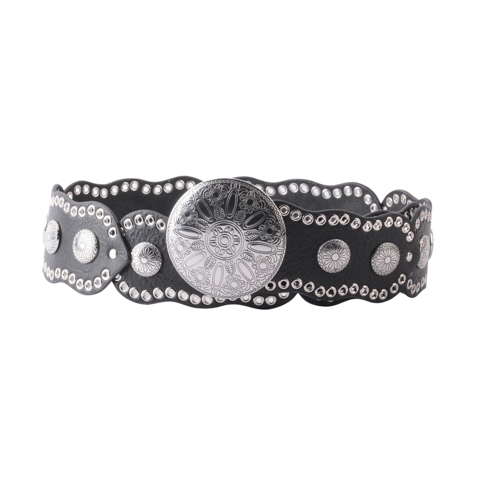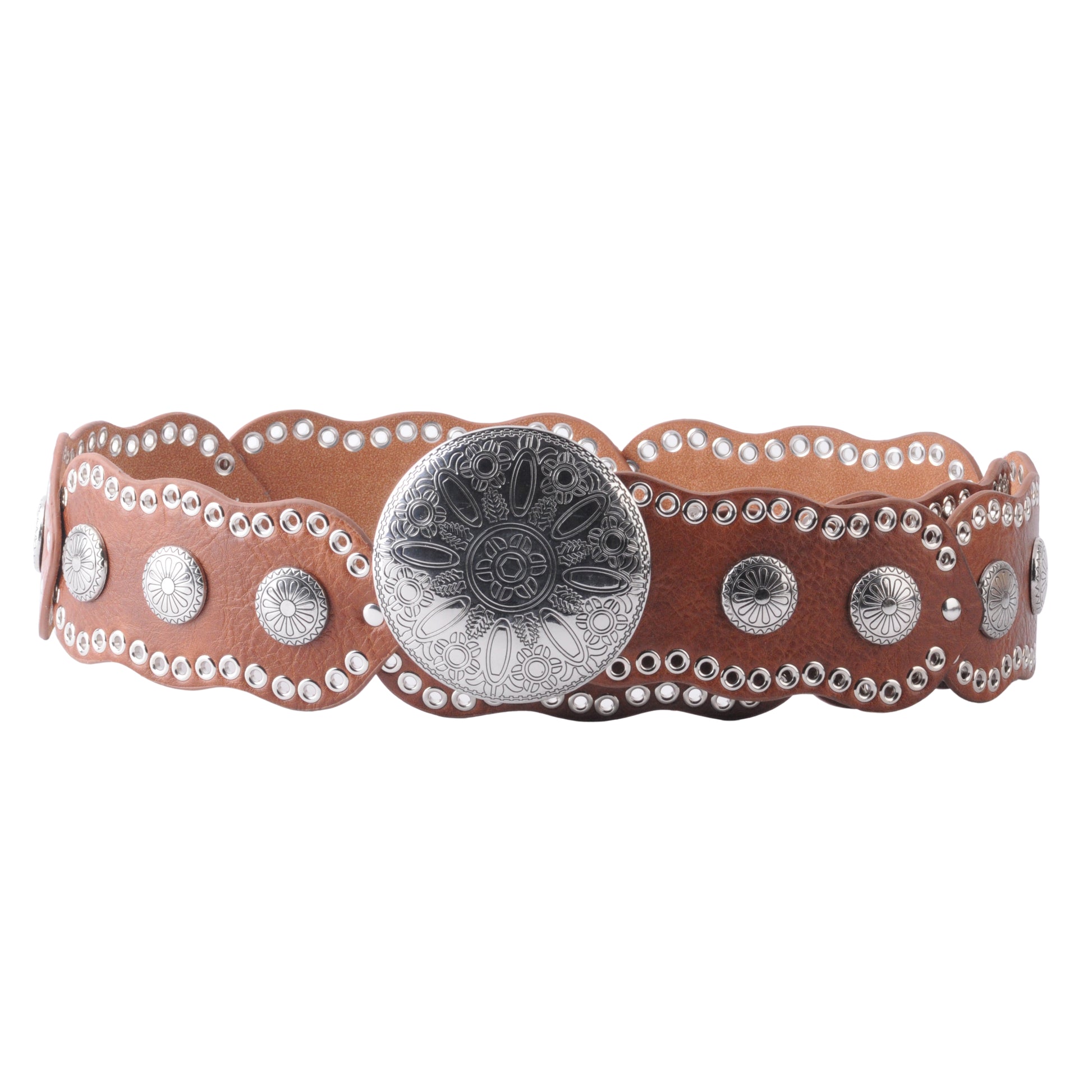 Elevate your western-inspired look with this concho-adorned leather corset belt. Crafted from premium full-grain leather, this wide waist-cinching corset belt features intricately placed metal conchos for a bold, authentic western aesthetic. Perfect for cowgirl chic outfits, boho western styling, or adding a statement piece to dresses, tunics, and layered ensembles.