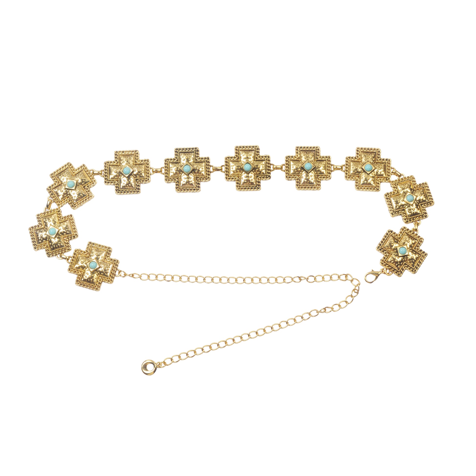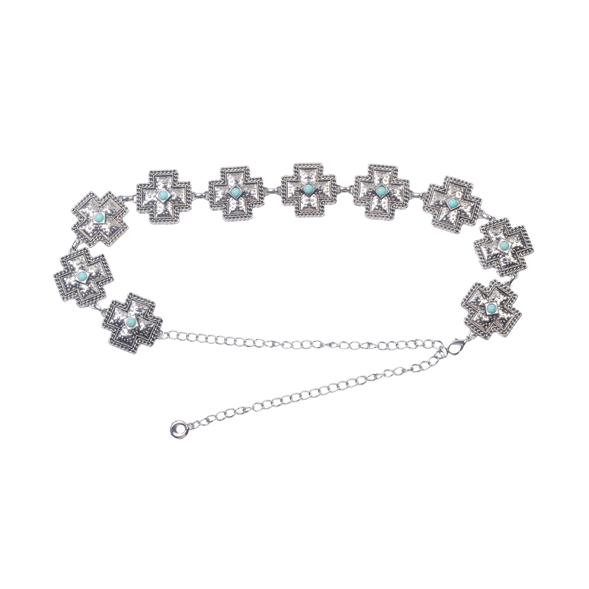Keywords: Western cross belt, embellished chain belt, engraved metal belt, cross concho belt, silver Western belt, statement waist chain, festival belt, cowgirl-inspired accessory