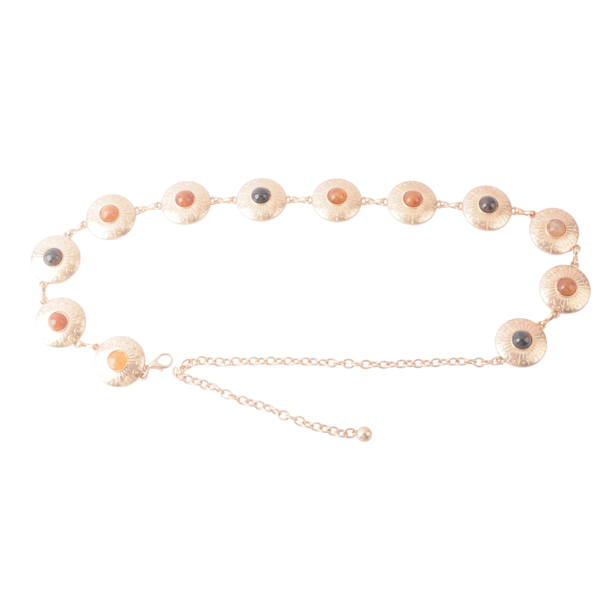 This gold-tone concho chain belt features engraved circular medallions accented with glossy cabochon stones in shades of amber, deep charcoal, and soft sand. The warm, gemstone-inspired colors bring an earthy yet elevated touch to any outfit. Adjustable and lightweight, this versatile belt layers beautifully over dresses, denim, or sarongs for a chic beach-meets-boho look.