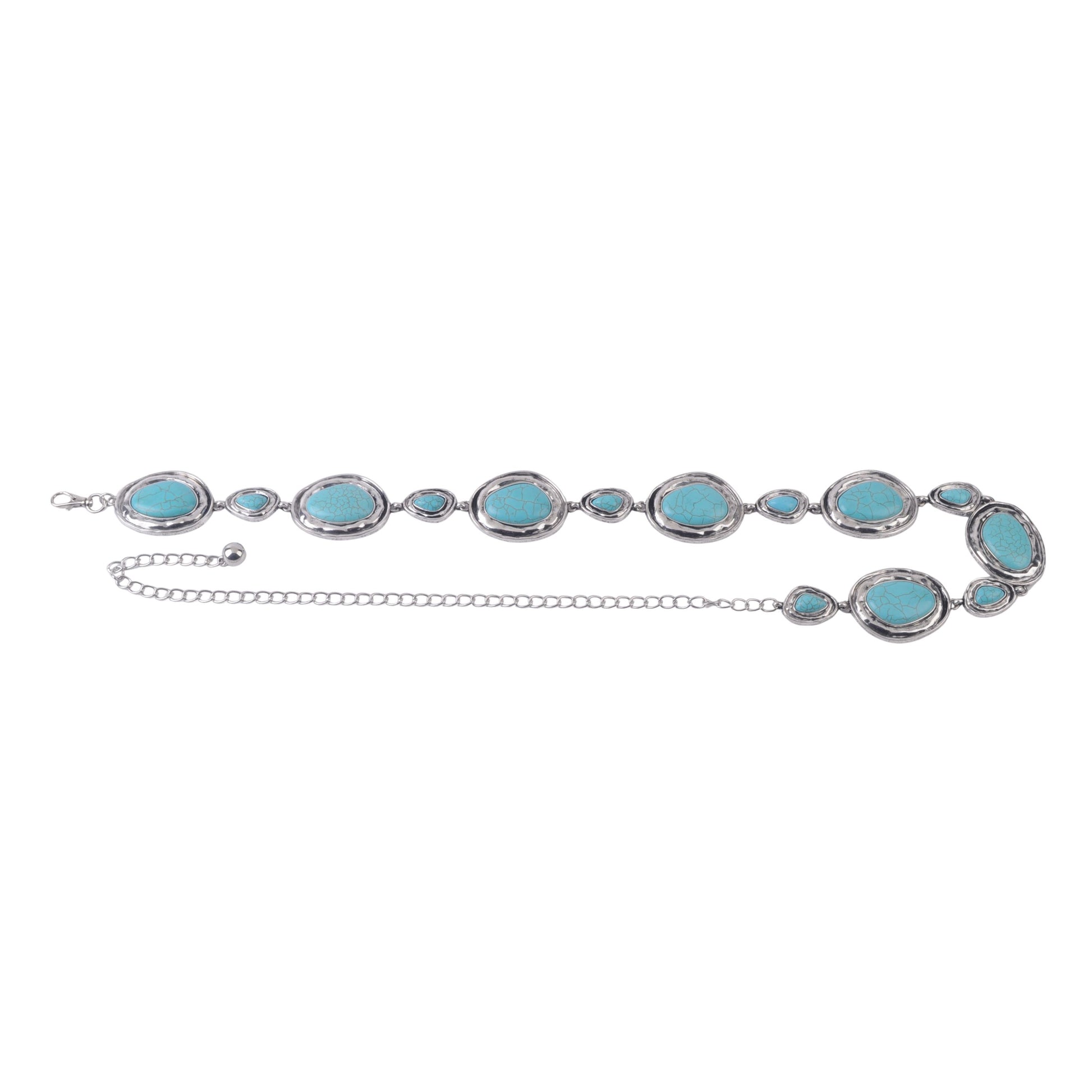 Keywords: turquoise chain belt, large stone belt, boho Western belt, statement turquoise waist chain, silver and turquoise belt, festival accessory, women’s fashion belt, adjustable concho belt