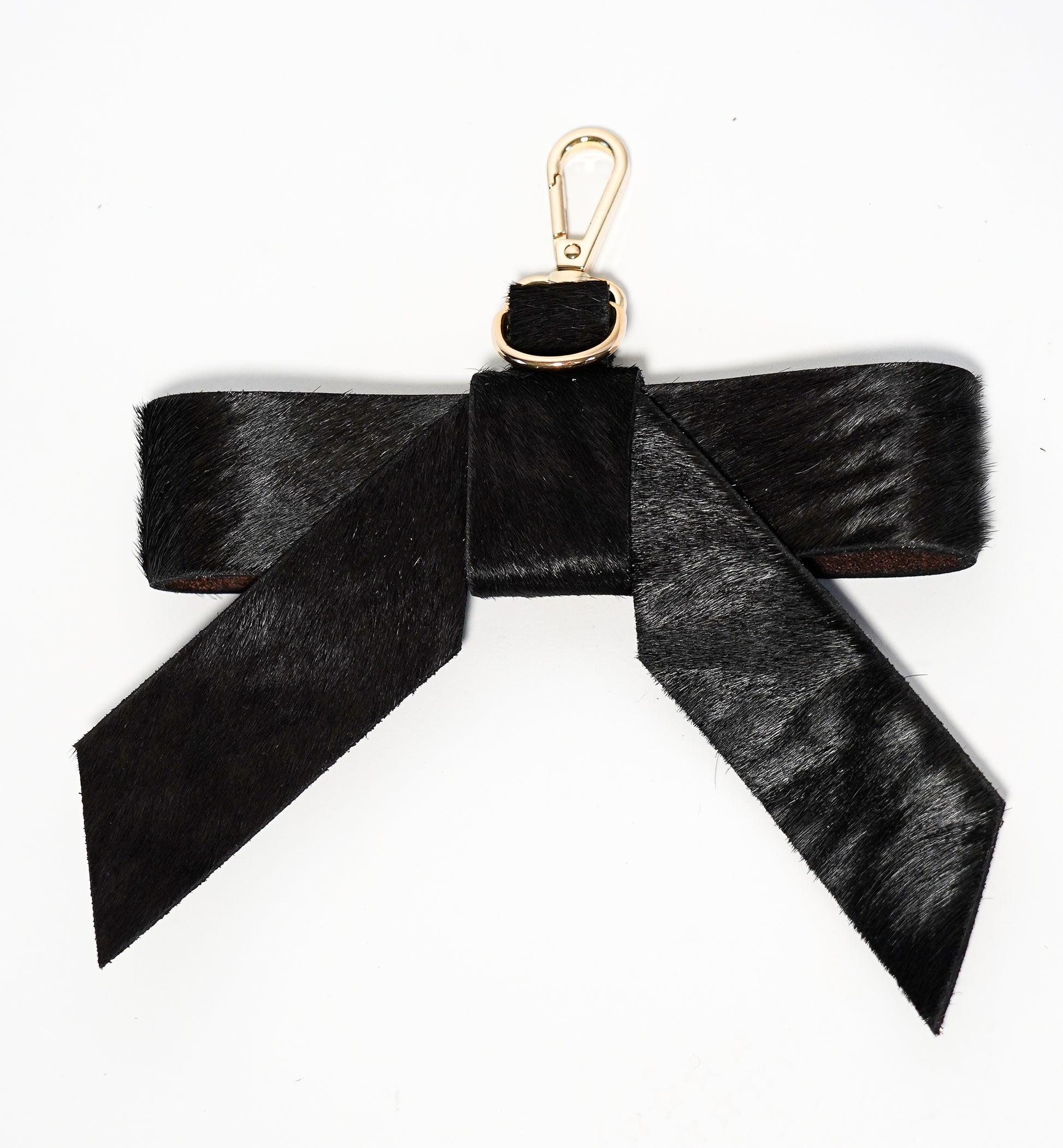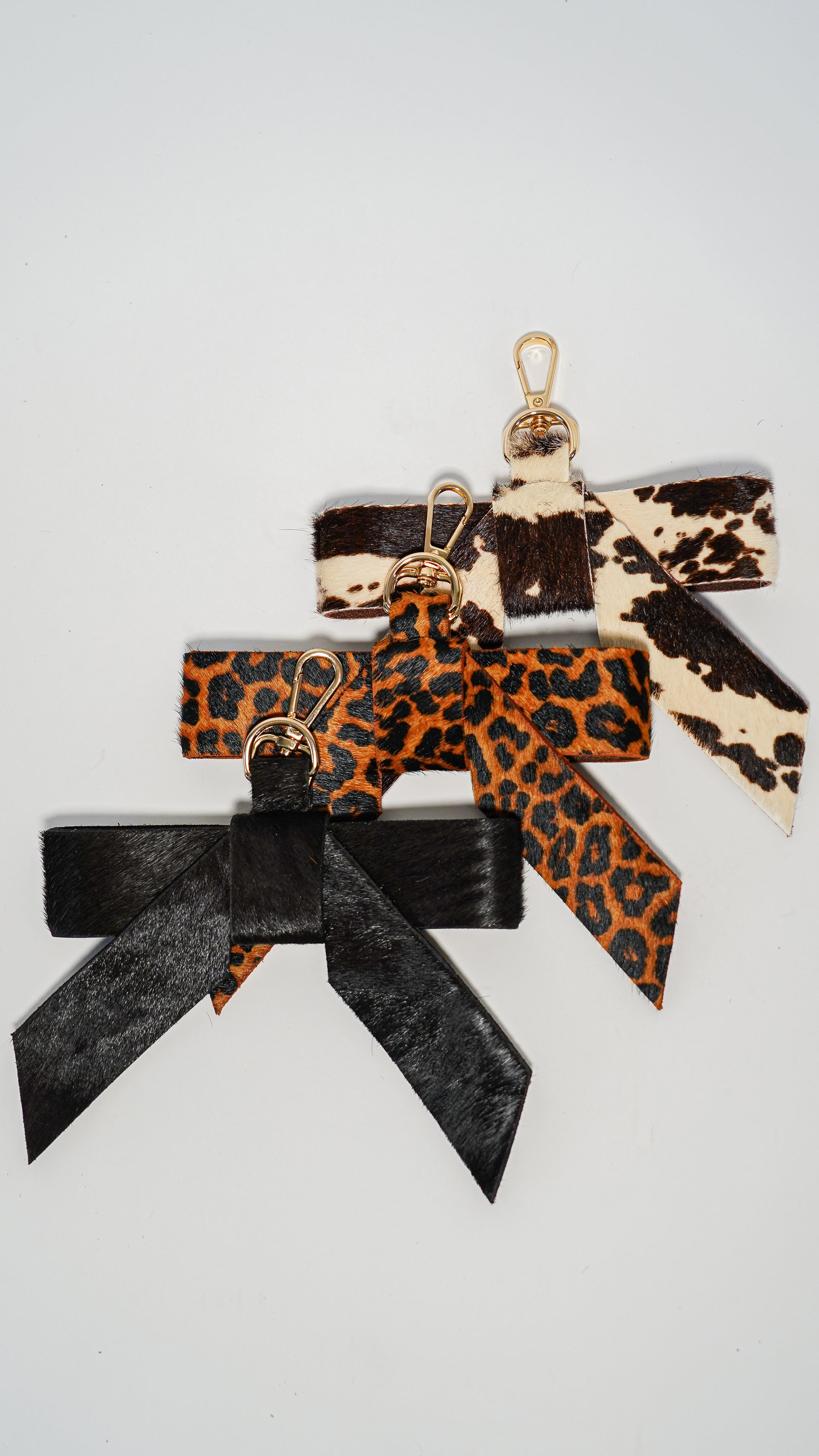 This bow charm is made of genuine leather and calf-hair. The added bit of texture creates dimensionality when this style is linked with a bag as a hang-off and catches light in the sunshine. Give your bags some elevated personality, all the while keeping your style classic and mature. Available in leopard, cow print and black.