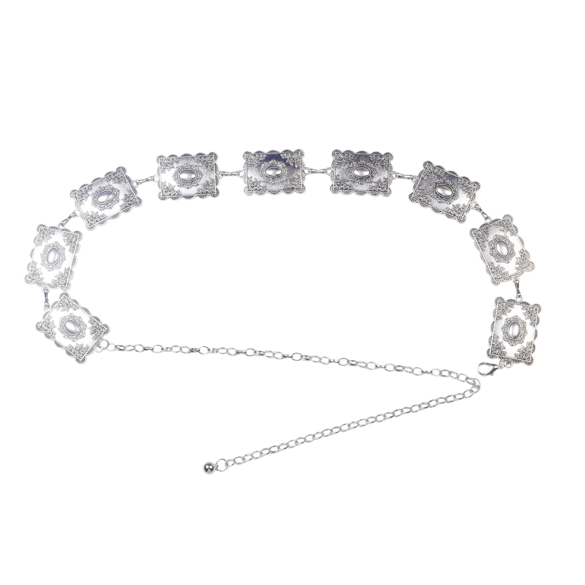 Keywords: ornate chain belt, rectangular link belt, vintage-inspired waist chain, embossed metal belt, statement chain belt, gold fashion belt, women’s decorative belt, boho glam accessory