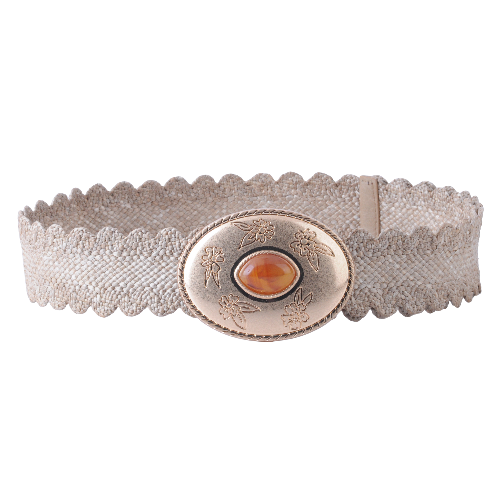 Scalloped Raffia Corset Belt with Amber Stone Buckle