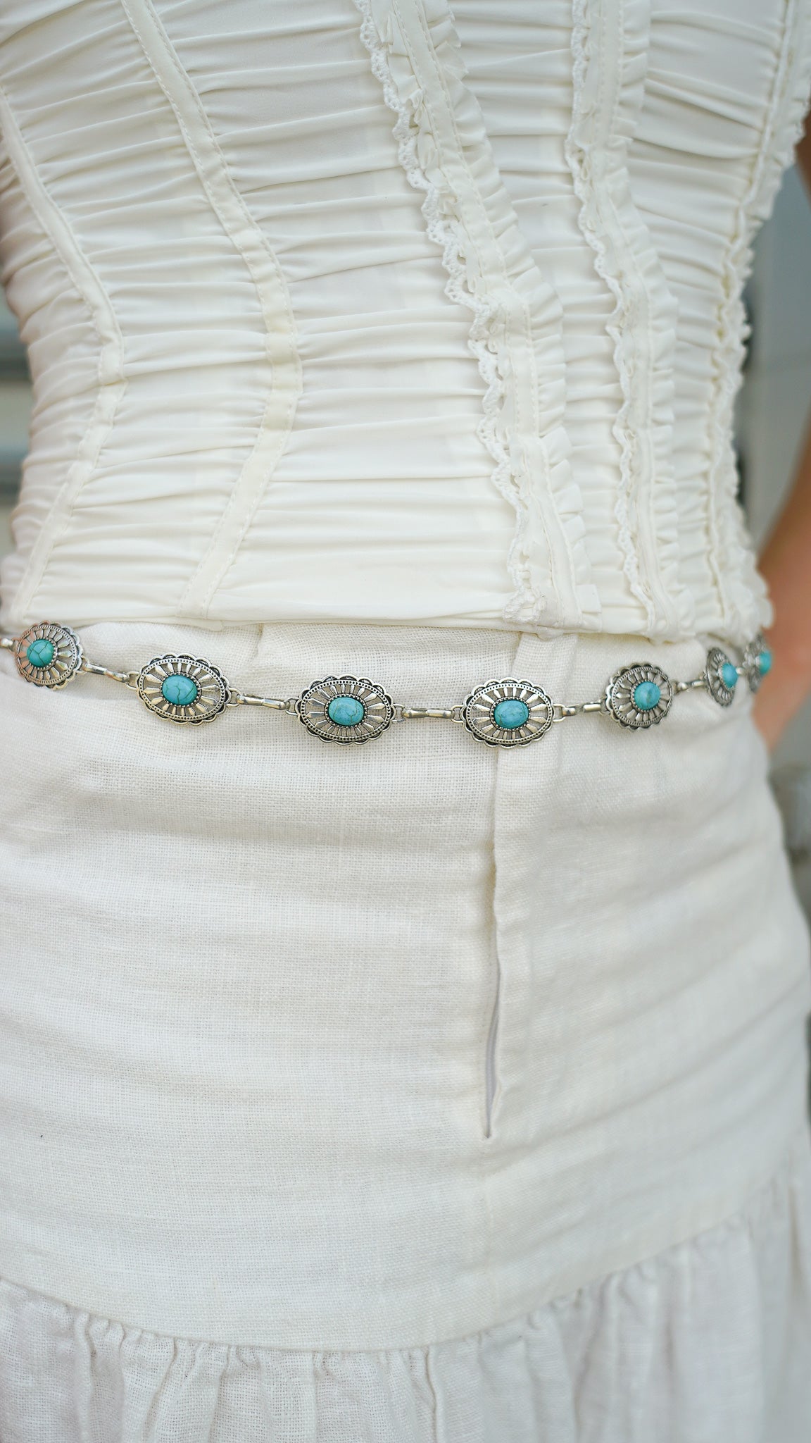 A subtle nod to Southwestern style, our Small Concho Chain Belt with Turquoise adds a pop of color and charm to any look. Featuring petite silver conchos accented with turquoise center stones and linked by a delicate chain, this belt brings a vintage-inspired, boho touch to denim, dresses, and skirts. Lightweight and adjustable for easy everyday wear.