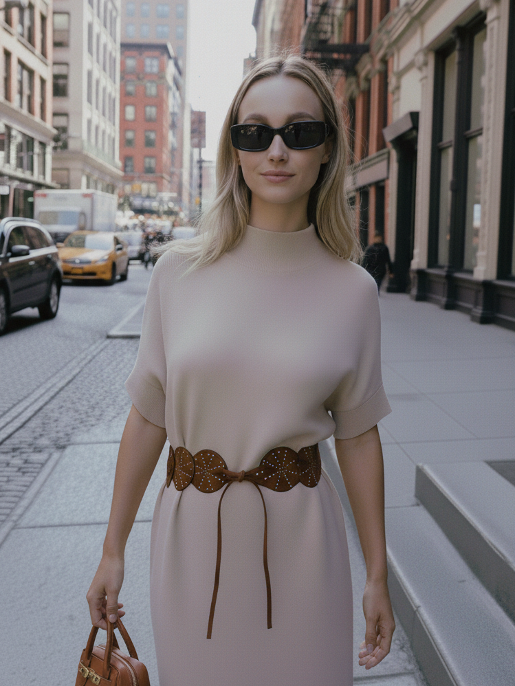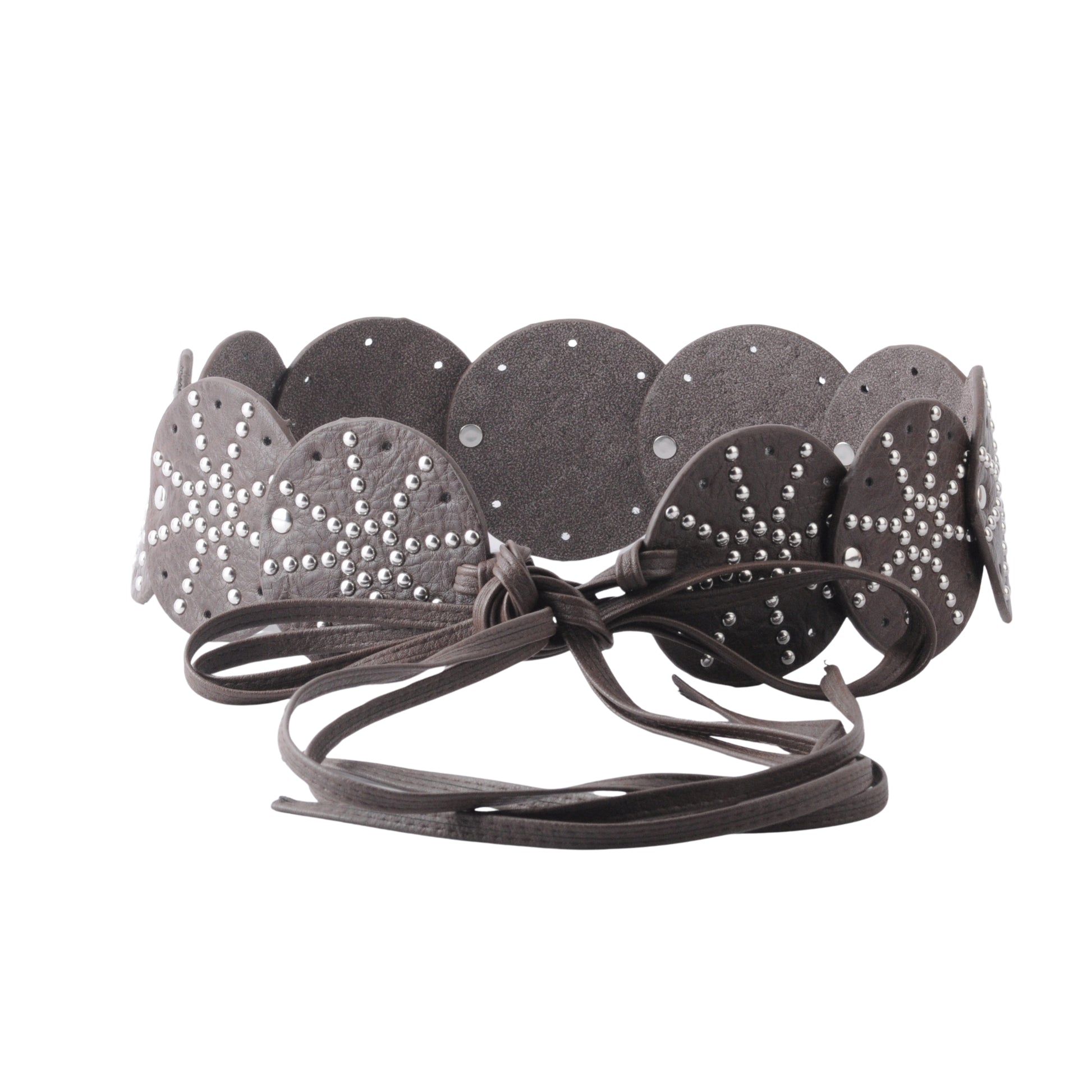 Channel effortless Western-boho style with this silver studded leather wrap belt, designed to cinch and flatter with an adjustable tie waist. Featuring polished silver studs and a bold panel silhouette, this belt adds a free-spirited, festival-ready finish to dresses, denim, and flowy layers. Crafted in versatile black, tan, and taupe tones for endless styling from rodeo nights to desert weekends.