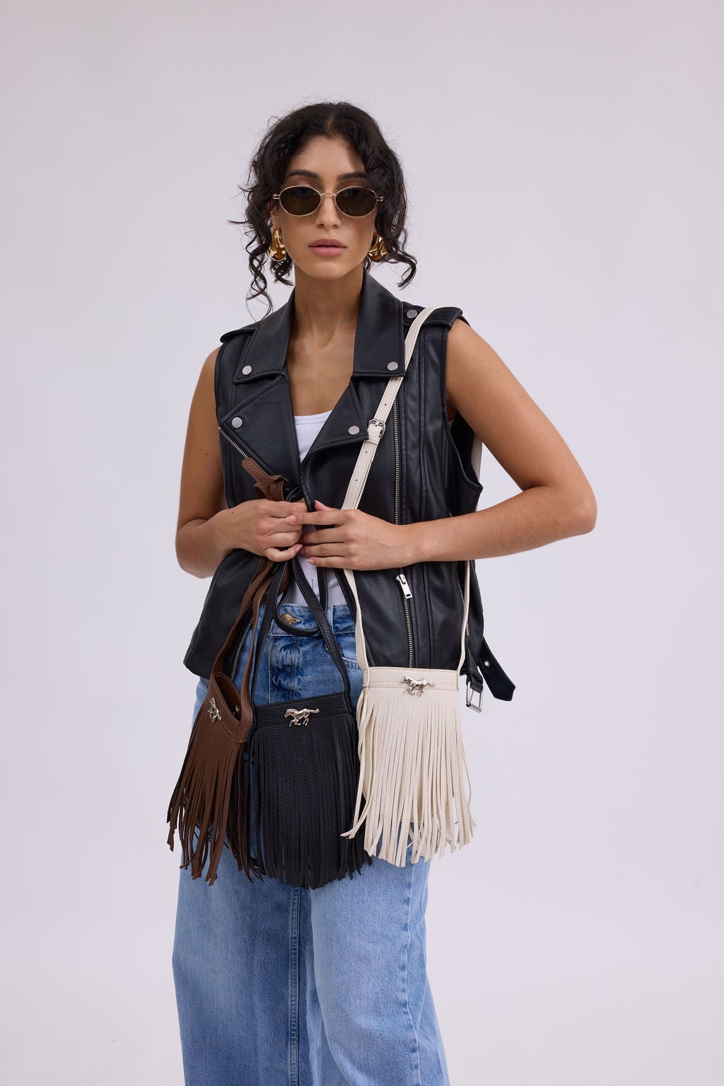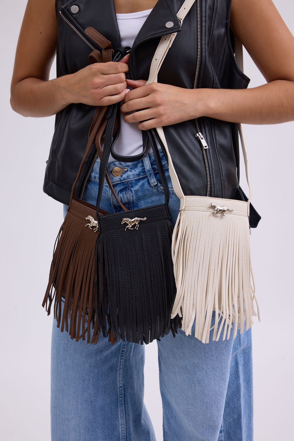 Step out in style with our Vegan Leather Fringe North-South Bag, featuring unique horse hardware that adds a rustic yet trendy flair. The stylish fringe detail not only enhances its bohemian vibe but also makes it a standout accessory for any outfit, perfect for the holiday season. Designed for versatility, this bag offers ample space for your essentials while making a chic statement. It pairs beautifully with your favorite holiday accessories and adds a touch of western charm to your look. This fabulous bag also makes a thoughtful stocking stuffer or gift for the fashion lover who appreciates eco-friendly style. Complete your winter ensemble with cozy scarves or fashionable hats for a complete look!