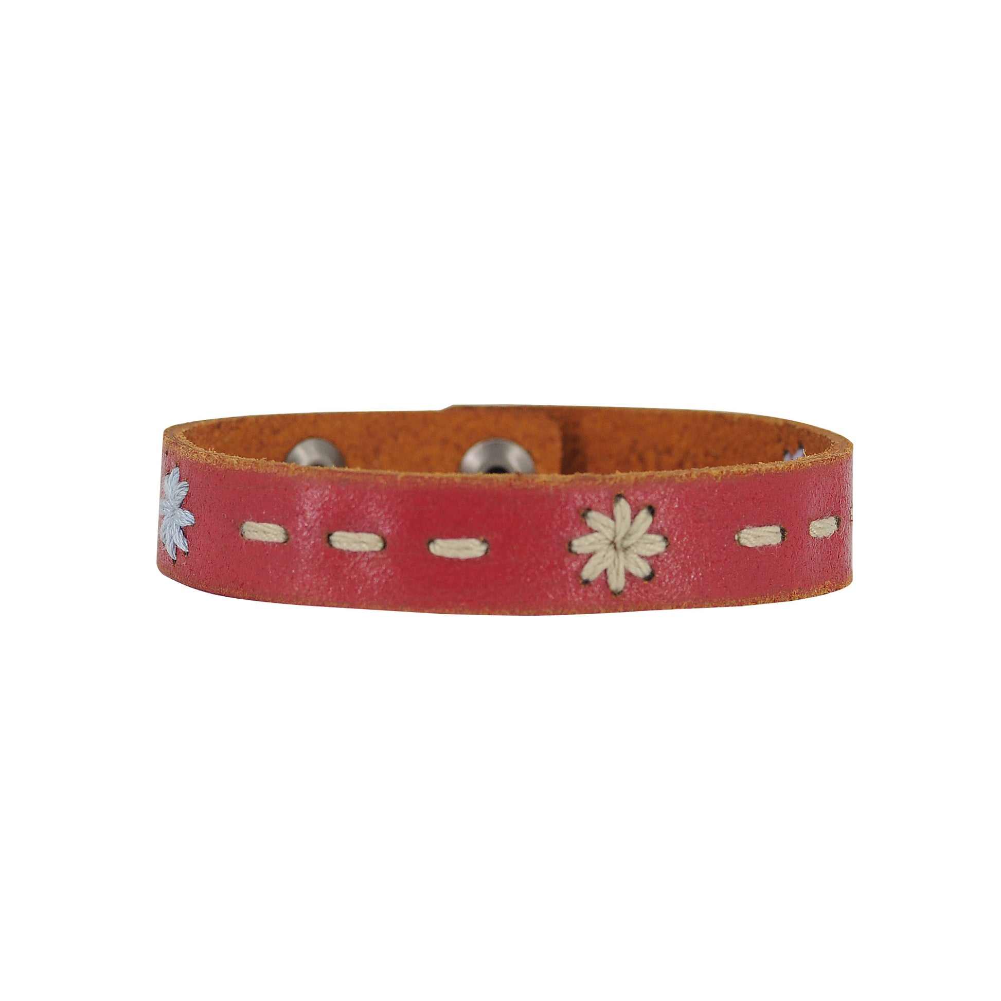 Cute never looked so good! Hand-stitched flower patterns in pastel colors. It contrasts perfectly on our genuine leather skinny straps. Bracelets are adjustable with two snaps.