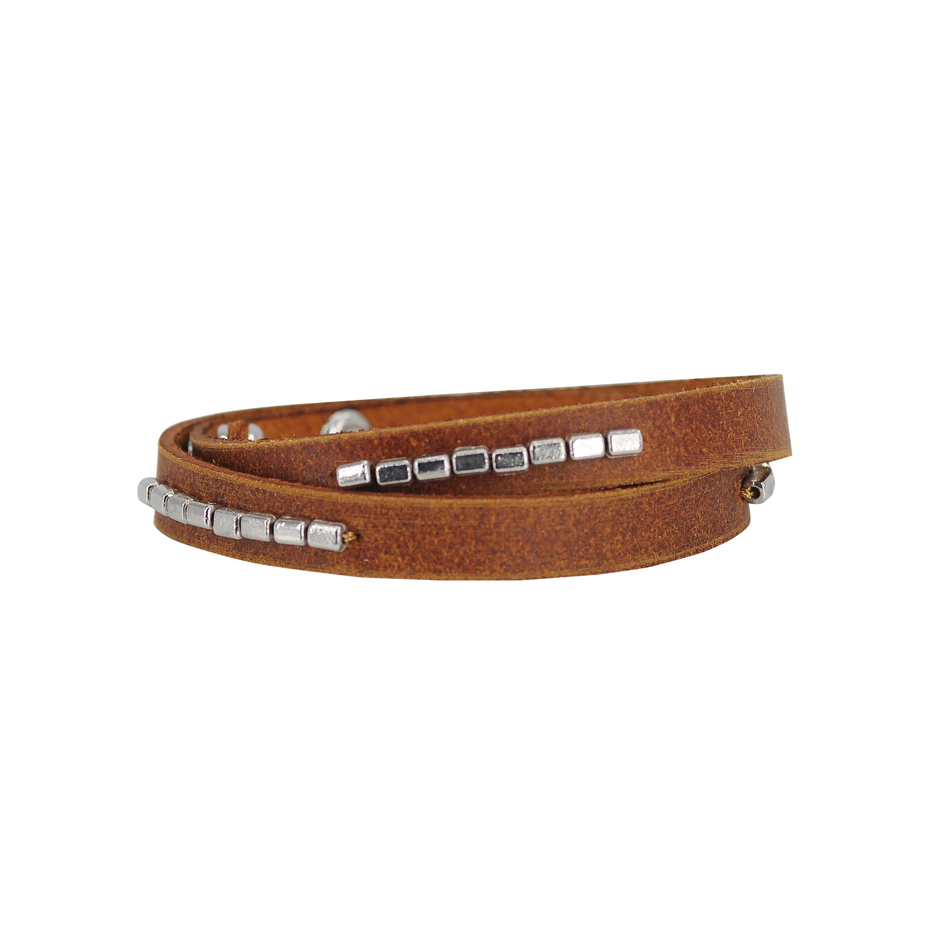 All genuine leather double wrapped bracelet comes in two different neutral colors: black and tan. The bracelets are embellished with rectangular beads, accentuating a classic yet empowering look.